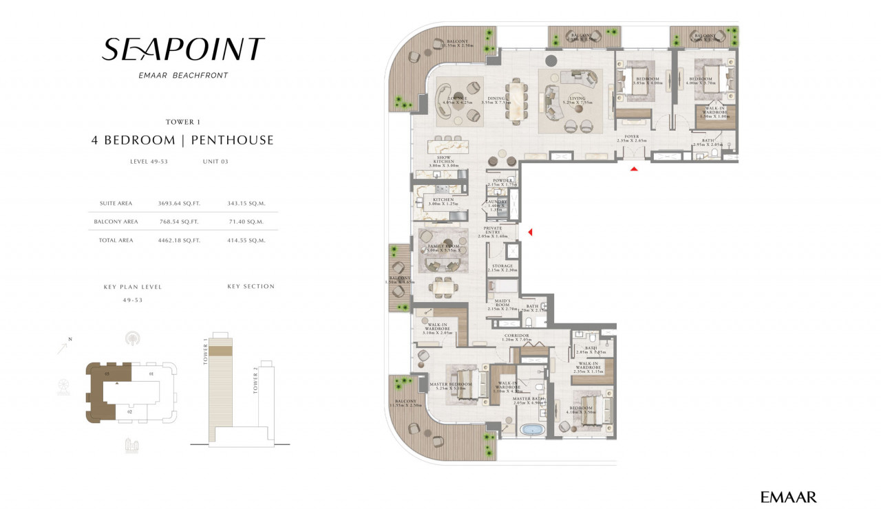 | Tower 1 | 4 Bedrooms + Maid | Unit 1, Level 49-53 toUnit 3, Level 49-53 | 4462.18Sq Ft to 5430.72 Sq Ft Sq Ft | Penthouse |