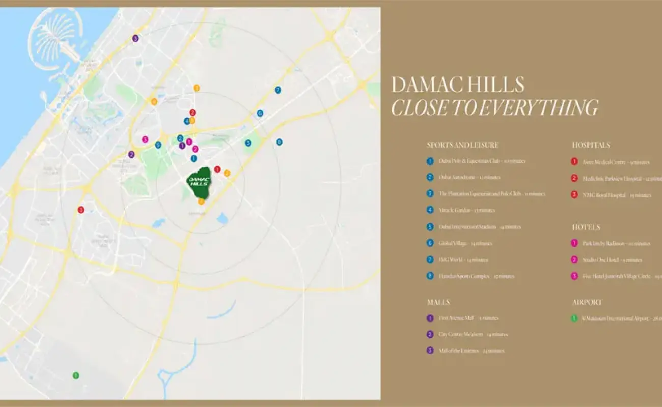 Belair Villas are strategically located within the pristine environment of Damac Hills, offering residents seamless connectivity throughout Dubai. The villas are just minutes away from key destinations such as Jumeirah Village Circle, Dubai Sports City, Marina Walk, Palm Jumeirah, and Burj Khalifa. This prime location ensures that residents can enjoy smooth and convenient access to the city's most prominent areas.