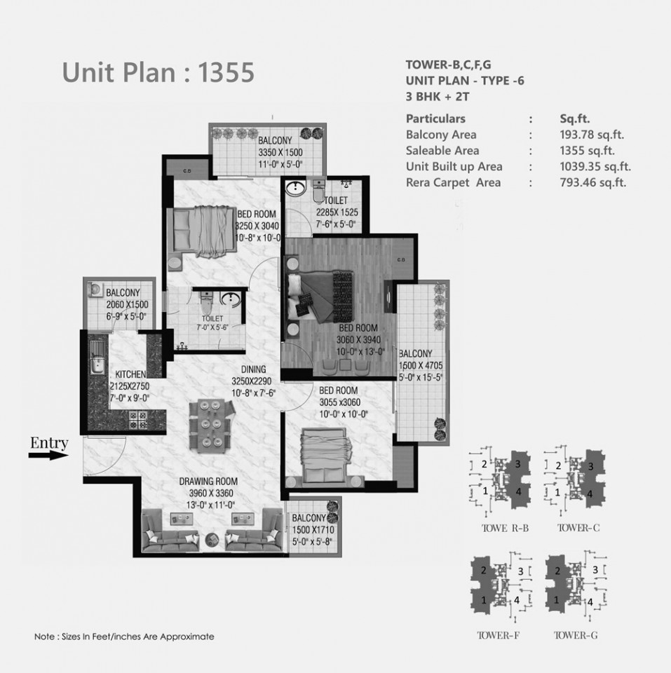 - 3 BHK Flats: 1355.0 Sq. Ft. - 1925.0 Sq. Ft.