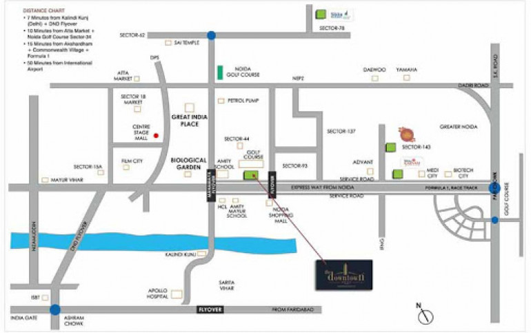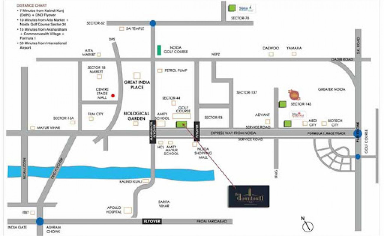 Strategically located, the Downtown is 7 minutes from Kalindi Kunj (Delhi) and DND Flyover, 10 minutes from Atta Market and Noida Golf Course Sector - 34, 15 minutes from Akshardham and 50 minutes from the International Airport.